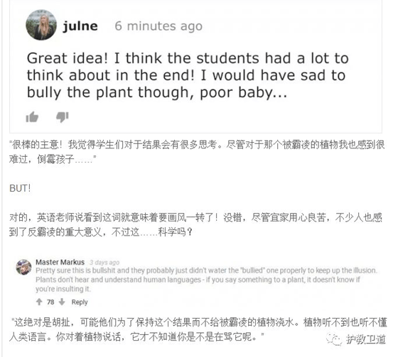 录下孩子们侮辱或赞美的话语分别播放给植物听,30天之后,被霸凌的植物近乎枯萎,而被表扬赞美的那盆却长势不错。