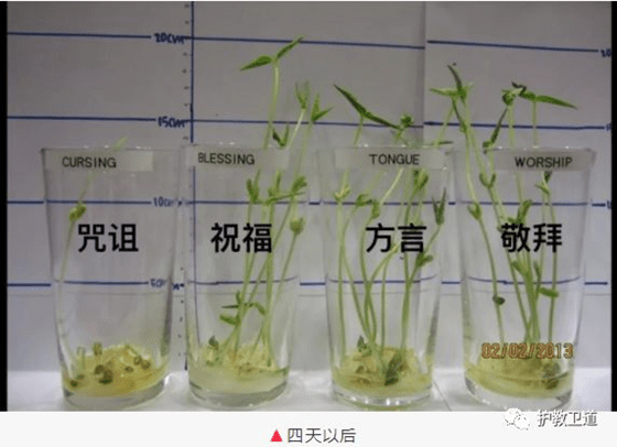 文中讲的是有位牧师,对水杯中的豆子(加了一些水)进行实验,分别是咒诅、祝福,听方言祷告和敬拜音乐。实验结果是,咒诅的杯子中,豆芽长势很差,而其它三个杯子的豆芽长得更好、更快。