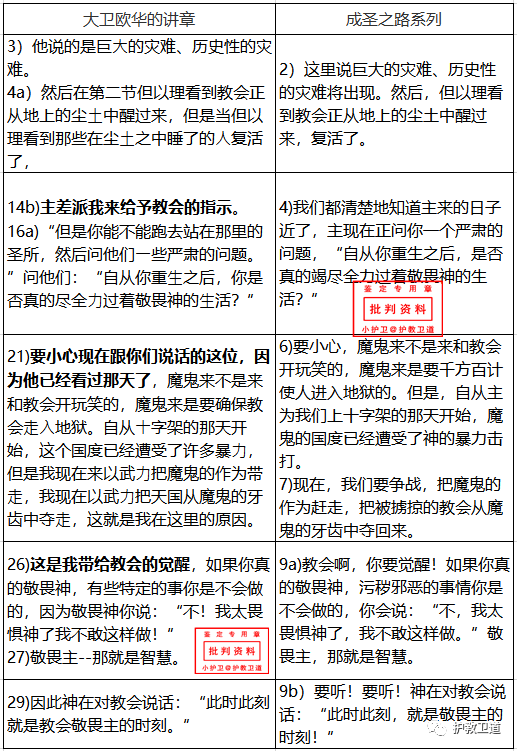 (为了便于描述,小护卫依据两者的排版,对段落进行了编号,大卫欧华的讲章共分为29段,“成圣之路”中的这部分内容分为10段。)