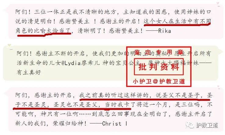 第三个人说:“感谢主的开启,我之前真的听过这样讲的,说圣父不是圣子,圣子不是圣灵,圣灵也不是圣父,当时我卡了将近一个月,是三位吗,不可能啊,神只有一位啊……到底怎么回事现在全明白了……”