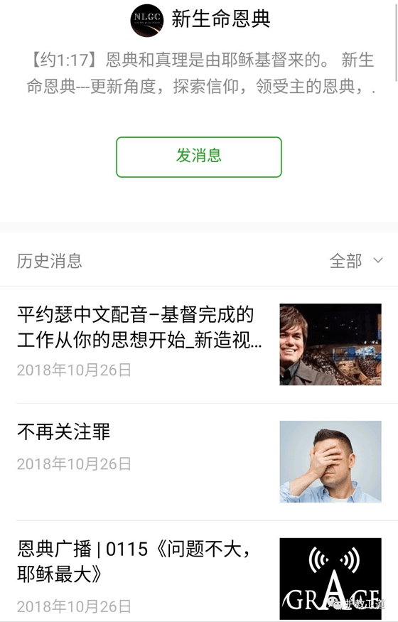 2018-10-26这天发的消息中,第一条就是“平约瑟”的讲道,第二条是《不再关注罪》,也比较符合恩典福音派的教义。
