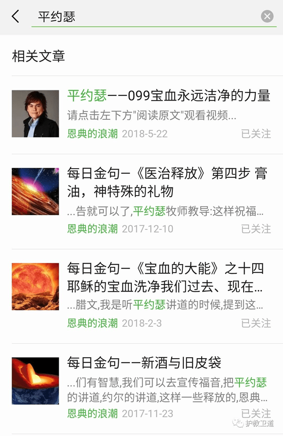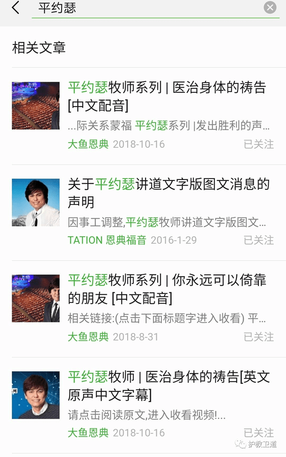 搜索结果是满屏的“平约瑟”的讲道,由此可判定此公众号属于恩典福音派无疑。