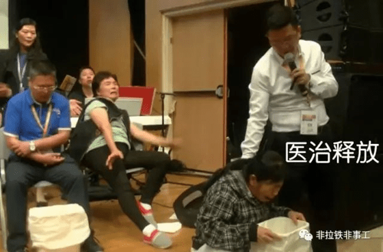 上图是“非拉铁非事工”上提供的有关医治释放的照片。为什么抱着一个套有垃圾袋垃圾桶?