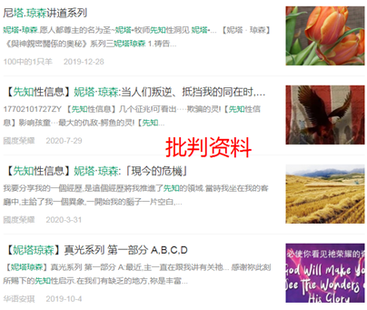“末后信息”的二级菜单中,“末后的日子1”、“末后的日子2”及“凡事求问神”,点开之后,全是杜丽艳的讲道信息。