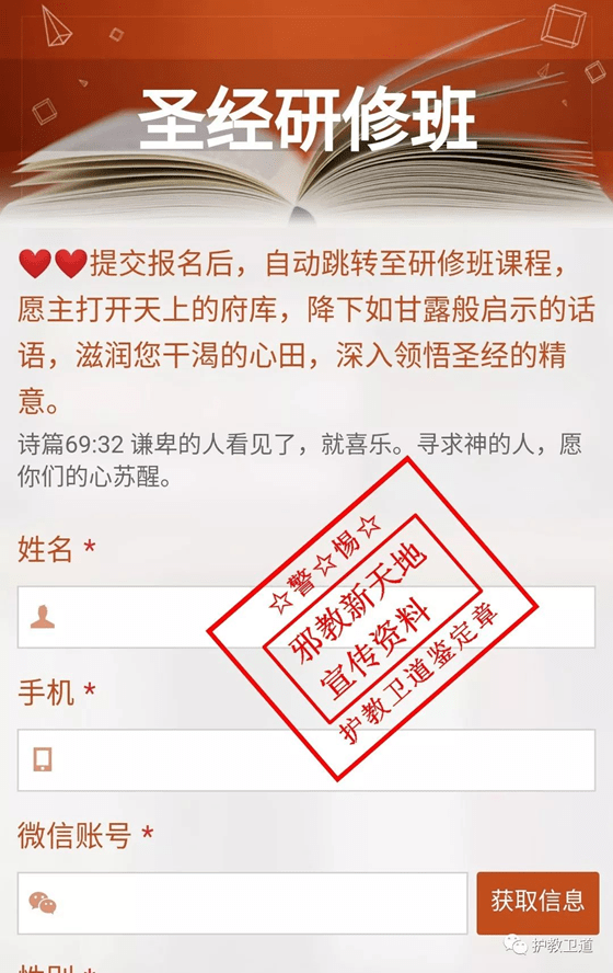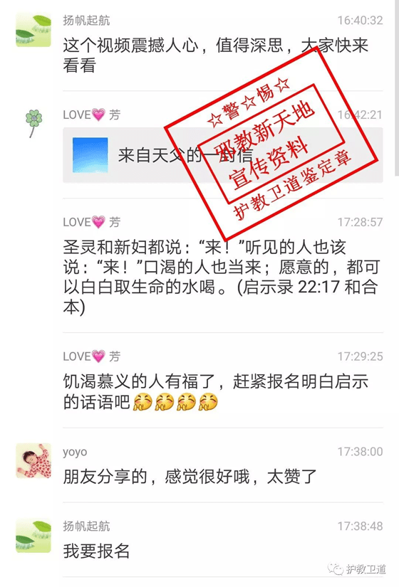 请大家务必保持警惕,千万不要参与该邪教新天地的网络课程,千万不要暴露自己的个人隐私给邪教分子!