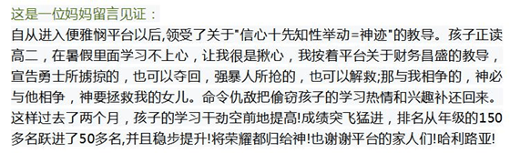 文中刊登了一位妈妈的见证,声称在便雅悯平台上,『领受了关于”信心十先知性举动=神迹”的教导』,通过宣告祷告,命令仇敌把偷窃孩子的学习热情和兴趣补还回来,两个月时间,孩子成绩突飞猛进,排名由150+飞跃到了50+。