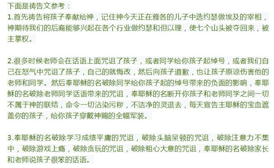 文章称,孩子身上有因为家长、同学、老师的负面言语带来的咒诅,还有与同学老师之间不属于神的联结,不洁净的灵,需要奉主的名破除和断开。