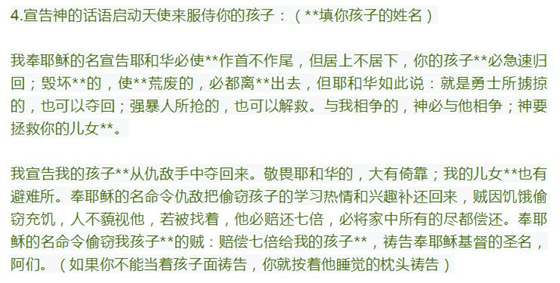 文中的祷文中,用箴6:30-31作为祷告词——『奉耶稣的名命令仇敌把偷窃孩子的学习热情和兴趣补还回来,贼因饥饿偷窃充饥,人不藐视他,若被找着,他必赔还七倍,必将家中所有的尽都偿还。奉耶稣的名命令偷窃我孩子XX的贼:赔偿七倍给我的孩子XX』