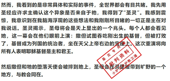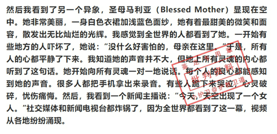 再接着,“娜娜”向主确认,得到了“圣灵”的“启示”——『圣灵揭示,圣母将会是天上显出的一个兆头。』
