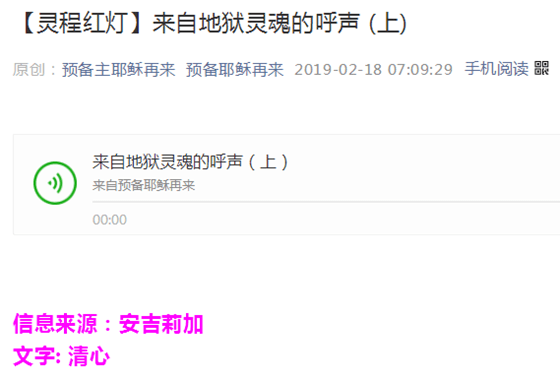 今天,有读者发我两篇文章,是一灵恩体系的公众号『预备耶稣再来』发布的《来自地狱灵魂的呼声(上)(下)》(2019-2-18、19)。