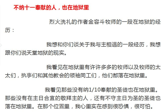 在《来自地狱灵魂的呼声(下)》中,则是引用了烈火洗礼的作者金容斗牧师的见证,来说明“不纳十一奉献的人,也在地狱里”。