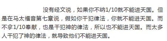 如果有人说,你不持守十一奉献,你就没有守全律法,你就无法得救,就会下地狱,那完全就是异端的道理。