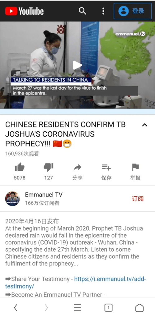 2020年4月16日,TB约书亚的“以马内利电视台”(Emmanuel TV),在油管上发布了一个题为“CHINESE RESIDENTS CONFIRM TB JOSHUA’S CORONAVIRUS PROPHECY!!!”(《中国居民证TB约书亚关于冠状病毒的预言!!!》)的视频[3][4],宣传说:TB约书亚的预言在中国应验了。