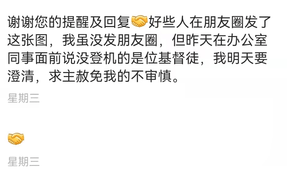 弟兄表示:他虽然没有发朋友圈,但却在同事面前说“没登机的是位JDT,我明天要澄清,求主赦免我的不审慎。”