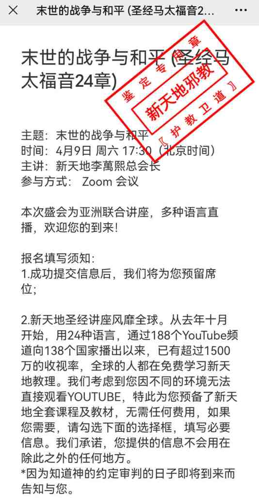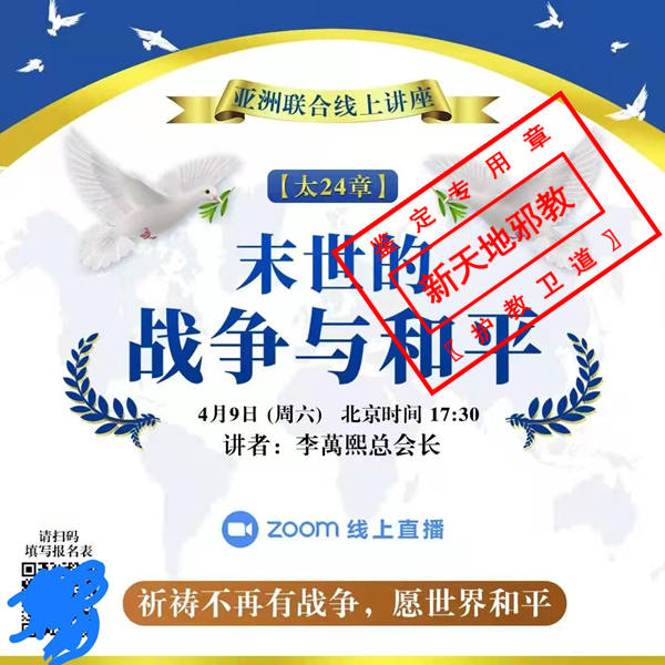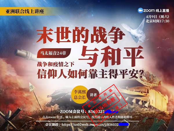 近日,在不少微信群里,出现了一个主题为《末世的战争与和平》的网络会议(ZOOM线上直播)的宣传海报(见图1~图4),举办时间为4月9日周六,讲者为“李万熙总会长”。