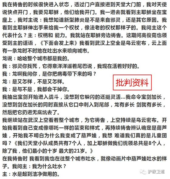 他把武汉上空吐水(大概是在喷毒)的龙(邪灵)扔进了无底坑,自己变成了“葫芦娃”,“主耶稣”授权给他,让他在武汉上空喷水洁净瘟疫。