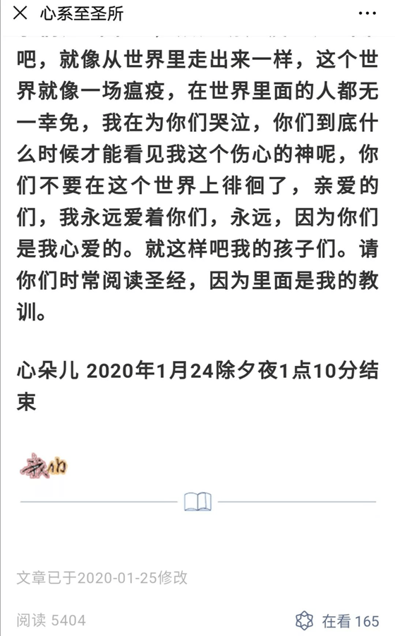 (1)作者和其小组成员一起就肺炎祷告询问主。将近半夜12点,其他人睡了,只有作者“心朵儿”(文末署名)和“高俊茹”领受到了启示。