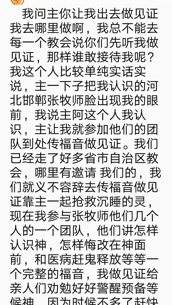 例如,这位沈翠娥“姊妹”提到自己参与了一个河北邯郸张牧师的团队。按她的说法,这个团队所讲的福音中包括“医治赶鬼释放”。小护卫初步判断,应该是一个灵恩色彩的团队。