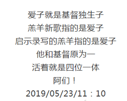 『爱子就是基督独生子,羔羊新歌指的是爱子,启示录写的羔羊指的是爱子,他和基督原为一,活着就是四位一体。』
