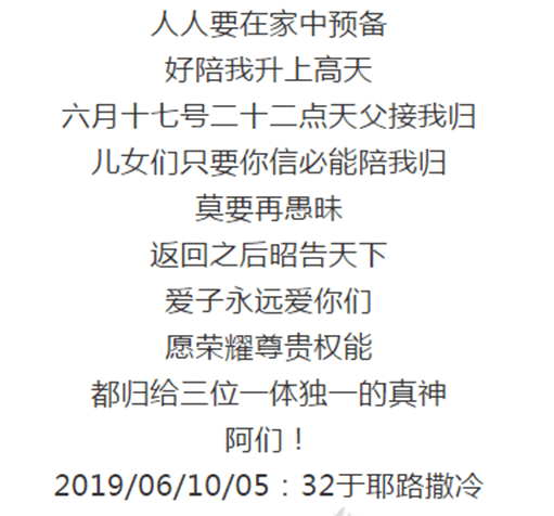 6月17号22点,“爱子”就要被天父接走升天了,相信的人可以一起陪他升上高天,紧接着,各种大灾难就要出现。