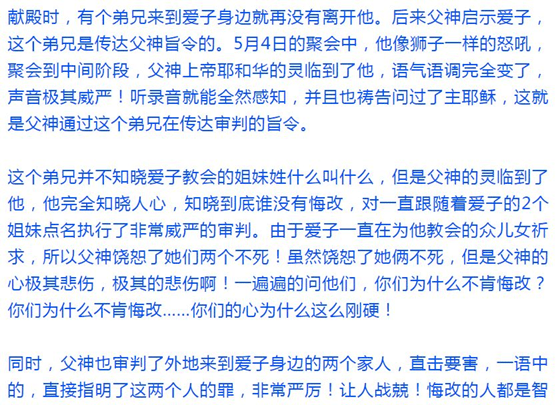 有位一直待在“爱子”身边的“弟兄”,在一次聚会中,“父神上帝耶和华的灵临到了他”,“父神通过”他“传达审判的旨令”,而且他还真的像模像样“审判”了几个人。