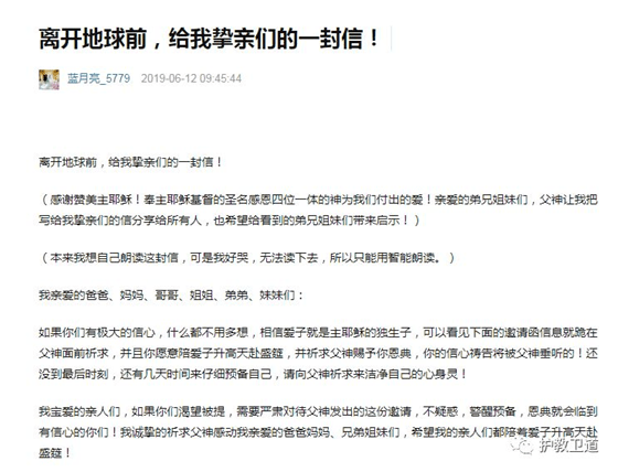 一直为“爱子”宣传的“蓝月亮”(〖心妇与良人更亲密〗的运营者),在6月12日发布了一篇情词迫切的诀别信——《离开地球前,给我挚亲们的一封信!》。