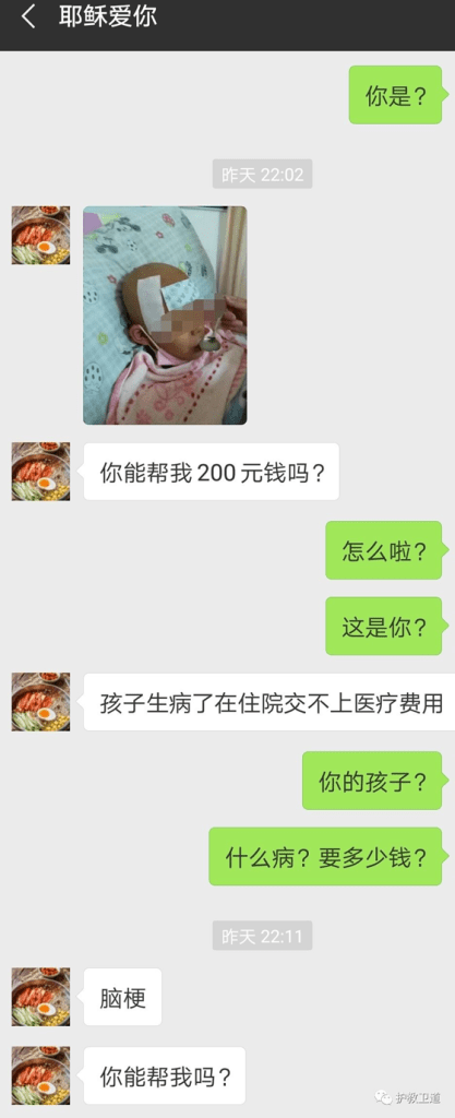 当时,这个“耶稣爱你”,加人好友或在微信群里,发送以下照片请求大家捐赠,而且一开口就是要200元。