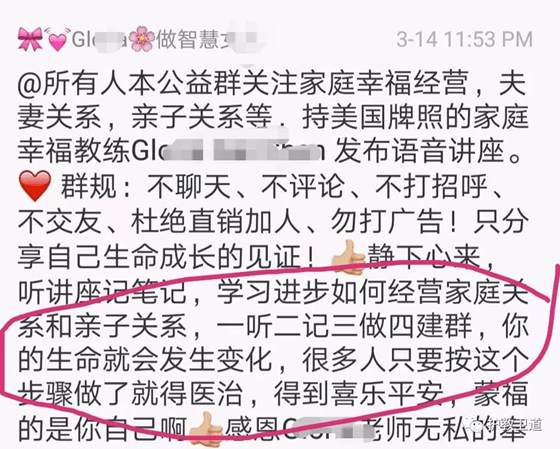 不少姊妹努力地建群、拉人、转发课程,免费地为Gloria打响了名声、扩大了影响力。根据读者反映,甚至一些传道人也建起了“智慧女人群”,其影响力可想而知。(我也曾在某个群里卧底了几天。)
