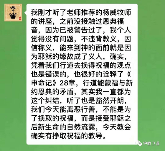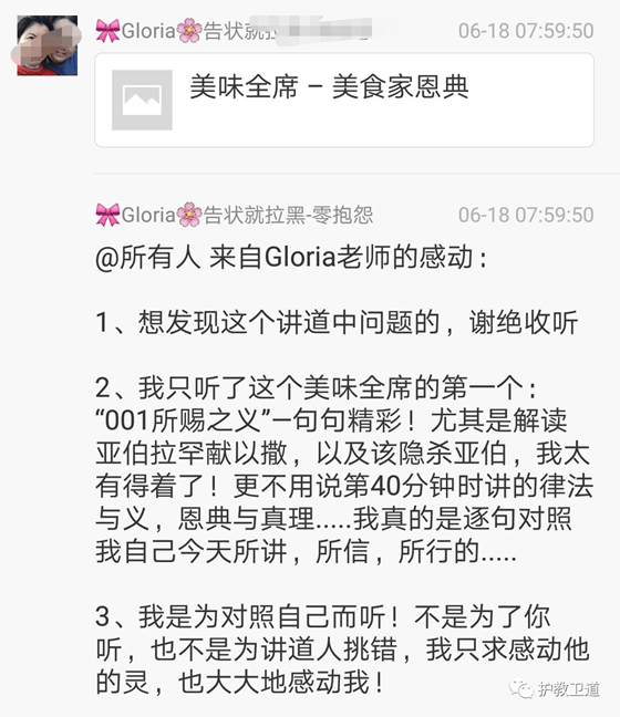 这是昨天晚上,小护卫所在的某个“智慧女人群”里,群主也转发了Gloria推荐的恩典福音派杨威的讲道集: