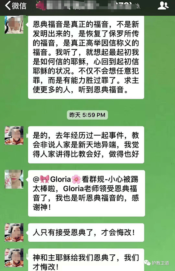 以下截图中,是几位姊妹看到Gloria推荐恩典福音后作出的反应。把“恩典福音”视为了真正的福音。其中有个姊妹竟然还同时支持邪教新天地。