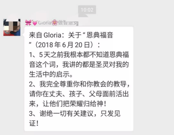 G认为自己原先讲的一直就是“恩典福音”,并且在朋友圈和她的微信群中,强调“感谢神,把恩典福音暗中完完全全启示给我!”