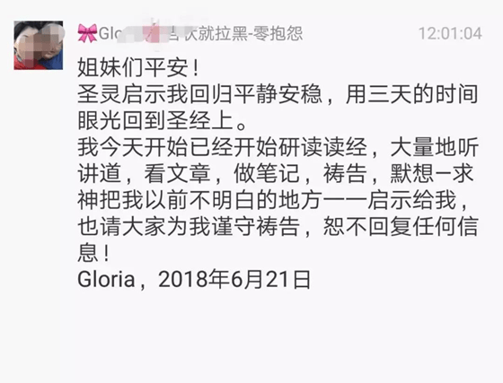 看,又是“圣灵启示”了她,让她回顾平静安慰,用三天的时候去研读圣经,大家的指责也好、意见建议也罢,统统可以不理会了——那可是圣灵启示的。