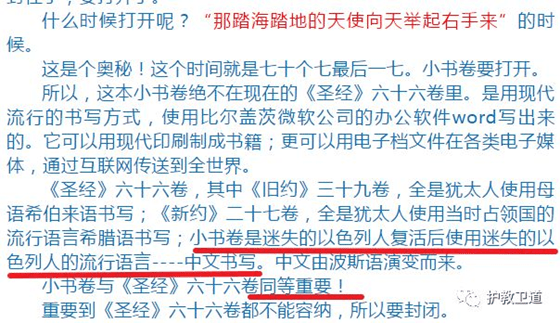 文章声称新的启示——“小书卷”——是用微软的word写的,是用中文书写的(该公众号称中文为“迷失的以色列人复活后使用的迷失的以色列人的流行语言”)。