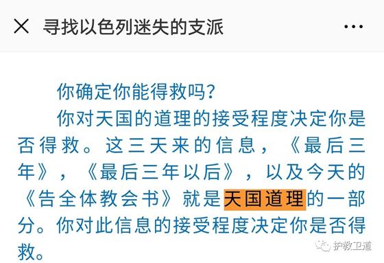 该公众号还曾说自己写的文章是天国道理的一部分,对他所讲的道理的接受程度决定了人是否得救。这未免把自己的文章看得太重要了吧?竟然还和人的得救与否有关。