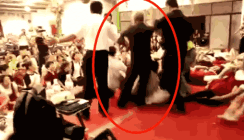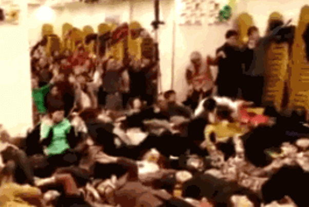 注意第一排,最后倒下的白色上衣姊妹,被两边活生生拽到在地……