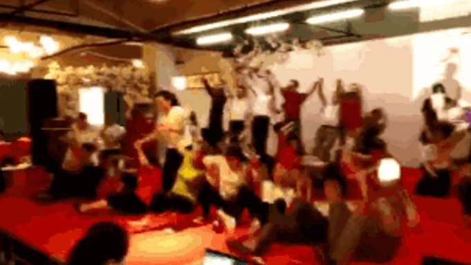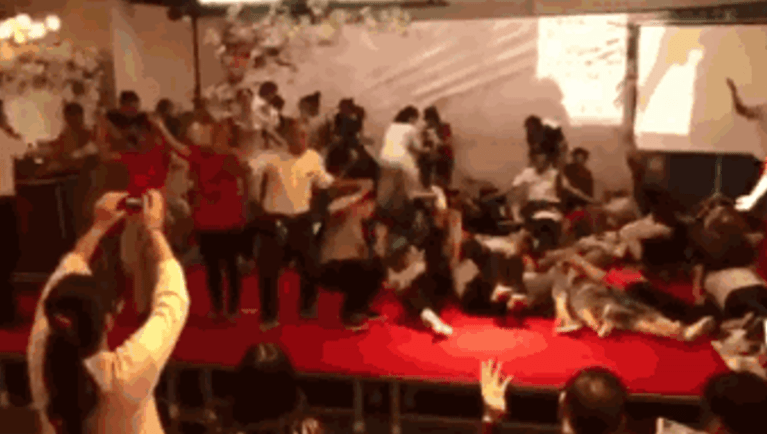 第一排白色上衣黑色裤子的那位中老年弟兄,大家依次倒下去时,到他这里遇到了阻力,明显停顿了一下,但最终他还是被左手的姊妹拉倒了。