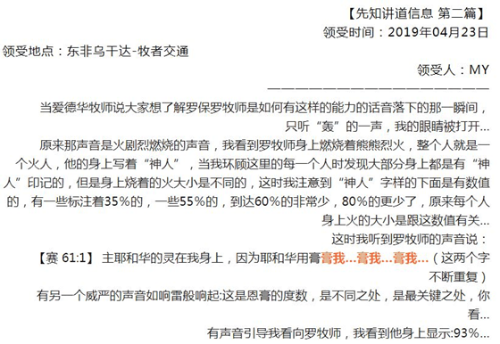 在《2. 非洲乌干达上百位牧师共同询问:罗保罗牧师你拥有恩膏的秘诀是什么?》(2019-05-06)中,附有3篇《先知讲道信息》,是罗保罗团队的成员领受的“启示”。